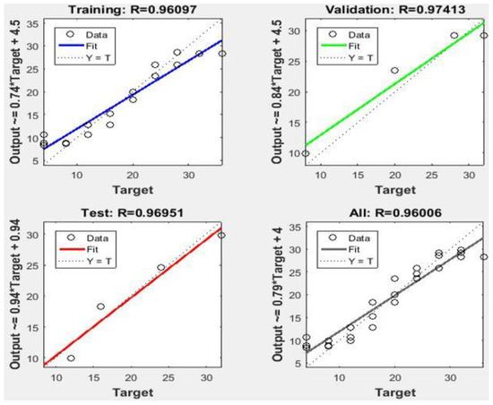 Most preceding leakage diagnosis approaches were based on static rules; the technique requires controlling all the information of the gas flow principle and microscopic model of the pipeline. The checking value of the same node was influenced by the position of various leakage points [59,60,61]. Moreover, uncertain aspects including medium composition and working conditions made it complicated to establish the constraints needed for modeling, which made it easy to cause errors or mistake diagnoses. The operating conditions of the extraction pipeline were time-consuming and complicated, so the traditional leakage diagnosis method of the pipeline cannot reflect the leakage state of the pipeline [62,63,64,65]. To solve the problem of precisely diagnosing and locating leakage points in gas extraction pipelines, a method combining laboratory experiments and ML is proposed in this study. The suggested approach considered the power of various input parameters on diagnostic and positioning accuracy. According to Figure 8, when the CP is used correctly, the data scatter will be less than the regression line.