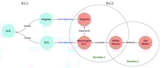 This paper proposes an iterative post-processing method called IPPT4KRL to refine the pre-trained knowledge graph embedding on individual KGs with a small number of overlapping labels and extra triples from another KG. The overlapping labels between KGs are usually known as seed alignments, representing a small portion of human-labelled equivalent entity pairs between the KGs. Our method divides the multi-KG representation learning into pre-training and post-processing stages. Knowledge graph embeddings are trained during the pre-training stage on individual KGs to best capture “domain-specific” knowledge. At the same time, additional relevant information from another KG is iteratively introduced in the post-processing stage to maximize knowledge transfer. During the post-processing stage, seed alignments are utilized to regularize the distance between equivalent entities in the embedding space. The pre-trained embedding space is post-processed with extra information introduced by the new KG. In contrast, an extra loss term controls the embedding space deviation from the original pre-trained embedding space. The extra information (triples) from a separate KG is introduced iteratively based on the adjacency to the seed alignments. As illustrated in Figure 1, entity Virginia and entity Washington D.C. are the two entities in with the equivalent counterparts in . Therefore, in the first iteration of the post-processing stage, triples (Washington D.C., AdjacentTo, Virginia) and (White House, LocateIn, Washington D.C.) are included. However, triple (Joe Biden, WorksAt, White House) is not included in the training until the second iteration because of the adjacency to aligned entities. To validate and assess the knowledge transfer induced by our proposed method in a life-like scenario, we generated a new dataset based on entity alignment benchmarking dataset D-W-15K [] with the sampling method introduced in the work of Sun et al. [], to create dangling entities (entities without alignment across KGs) within KGs. Triples in the sampled KGs are further split into training, testing, and validation sets for the embedding evaluation with the LP task. We also identified several existing methods of multi-KG representation learning and benchmarked the results against our proposed method across multiple datasets. To the best of our knowledge, this is the first work that provides benchmarking results with multiple relevant works on multi-KG representation learning under the same problem set. Experimental results on the generated dataset and three other datasets showed that our relatively lightweight IPPT4KRL method can achieve comparable and superior results against state-of-the-art models. A more detailed description of our IPPT4KRL method is provided in Section 3, and the experimental results on the empirical datasets and the ablation studies are shown in Section 4.