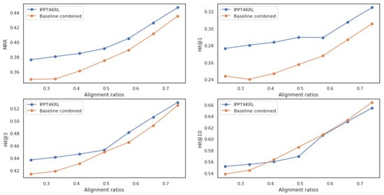 We experimented with different seed alignment ratios to better understand the nature of knowledge transfer between KGs. Figure 2 compares the best performances between IPPT4KRL and the baseline Connected with varying alignment ratios on the D-W-15K-LP dataset. In a similar study, ref. [] used ATransN, where they framed the baseline Connected as the upper bound of improvement. This is because they assumed that seed alignments used by the models include all possible alignments between KGs. We argue this is extremely unlikely in reality. Therefore, in our study, we kept the total number of aligned entities between KGs constant while varying the number of seed alignments available to the model during training. The best performance for IPPT4KRL was obtained with negative sampling turned off for scenarios with less than a 50% alignment ratio and negative sampling turned on for scenarios with more than a 50% alignment ratio. It can be observed that, as the alignment ratio increased, the performance of both models increased across all metrics. At the same time, IPPT4KRL consistently outperformed the baseline Combined in all metrics, except Hit@10, on which the two models achieved very similar performances.
