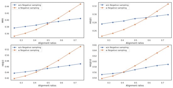 Negative sampling is one of the most-effective techniques in knowledge graph representation learning. In our IPPT4KRL framework, we employed uniform negative sampling for the pre-training stage of . In the post-processing stage, we observed some inconsistencies in the effects of including negative sampling: including negative sampling in the post-processing stage did not always provide knowledge gains to the representation learning of . In Table 6, we present the experiment results demonstrating the effect of negative sampling during the post-processing stage. From the results, it can be observed that negative sampling tended to be more beneficial for knowledge transfer for datasets with higher seed alignment ratios (CN3l, DBP-FB), while on the datasets with lower seed alignment ratios (D-W-15K-LP, Wk3l), additional negative sampling during the post-processing stage limited the amount of knowledge transfer between the KGs. We further validated this observation on the D-W-15K-LP dataset with varying alignment ratios, comparing model performance with the inclusion and exclusion of negative sampling in the post-processing stage. From Figure 3, it can be observed that, as the alignment ratio increased, the model with negative sampling enabled during the post-processing stage gradually outperformed the model without negative sampling enabled in all metrics. We believe this could be a very good starting point for future research on characterizing positive and negative knowledge transfer between KGs.