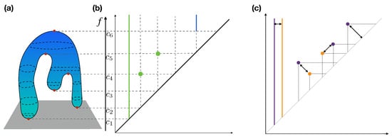 Persistent homology. Let us consider a topological space X and a continuous function . The (homological) critical values of f induce a sub-level set filtration of X. (a) Critical values of the height function on a topological sphere. Sublevels of the filtering function f—namely, , for every —yield a filtration of the topological sphere. (b) Changes in the number of generators of the kth homology groups along the filtration can be represented as a persistence diagram. 0-dimensional holes (connected components) are represented as green points. The void obtained at the last sublevel set gives rise to the blue line. (c) Persistence diagrams can be compared by computing an optimal matching of points. Unmatched points are associated with their projection on the diagonal.