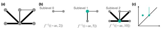 Let be the set of all subsets of elements (vertices and edges) of G. Let F be a graph-theoretical property, e.g., local degree prevalence, independence. The persistent feature associated with F is a Boolean mapping returning true if the property F holds for a certain subset and false otherwise. Symmetrically to the topological persistence framework, we evaluate for every subset of every . See Figure 2b. Then, we compute the steadiness of each subset s along the filtration by counting subsequent sublevels such that . As in [], we refer to as the steady persistence of the feature on . This construction yields a persistence diagram. See Figure 2c.