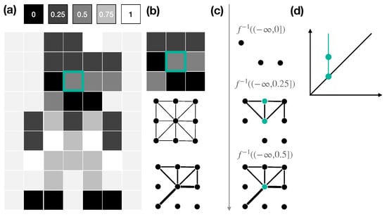Persistent features require a filtered space to be computed. Thus, after associating a graph to an image (or time series), we define the weighting function , where S is the set of all subsets of and . Importantly, f can carry additional information about the original data. For instance, when considering images, one can associate with each vertex the intensity value of its underlying pixel, and leverage this information to compute appropriate weights in a process reminiscent of message passing in graph neural networks []. The weighting function f induces a sub-level set filtration of the graph associated with each pixel of the image. See Figure 3a,b for an example.