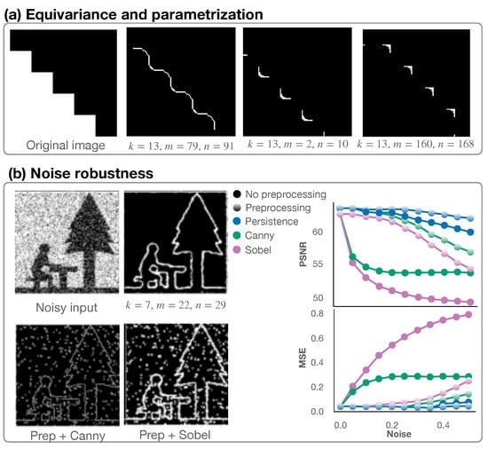 Persistence-based filter. (a) The persistence-based filter acts in an equivariant fashion (the same feature is recognized throughout the image) and parametrization changes lead to the detection of heterogeneous features. (b) We perform edge detection on a noisy input ( of the pixels are salt and pepper noise). Performance is compared across the proposed persistence-based filter, Canny, and Sobel edge-detection algorithms with and without preprocessing (median filter). Results are showcased for different ratios of noisy pixels. On the right, we compare the Mean Square Error and Peak Signal to Noise Ratio across the considered edge-detection algorithms.