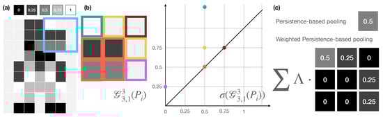 We consider an image I and split it in a collection of patches of size . For every pixel , we compute for some fixed values of and k (padding is added if needed). This procedure, which computationally boils down to sorting and slicing operations, yields a persistence diagram with a point per pixel in . Indeed, we compute the operator for every , padding the patch whenever necessary. Symmetrically to the classical max-pooling operator, the maximum persistence—i.e., the distance from the diagonal—shall determine the value to be associated with the entire patch and its downsampling. As an example, see Figure 5a,b, and the top row of (c).