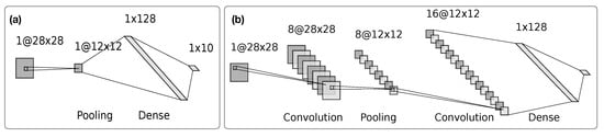 Benchmark architectures. The two architectures used in computational experiments. (a) A toy neural network where a pooling operator is applied directly to input images. The downsampled output of the pooling layer is passed to a dense classifier. In other words, first, the pooled output is flattened, then its dimensionality is reduced to match the number of classes to be predicted by the network. (b) As common practice for CNNs, this architecture alternates convolutional and pooling layers before the dense classifier.