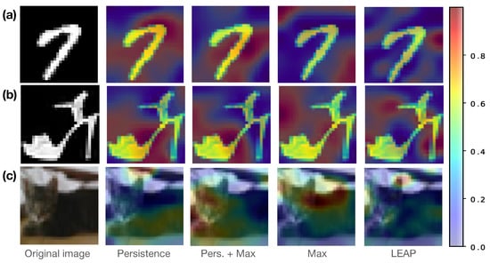 Pooling operators aim to select salient features of their input. Grad-CAM heatmaps [] are a visualization tool for highlighting regions of the input that contributed most to the model’s prediction. Figure 7 showcases Grad-CAM heatmaps obtained through the considered architectures on random input samples. As expected, the persistence-based pooling and its combination with max-pooling yield similar yet distinct heatmaps. In particular, although non-topological, the persistence-based pooling seems to capture geometrical and topological features of the images, such as corners and regions that would cause the foreground image to disconnect. See Figure 7a,b, respectively.