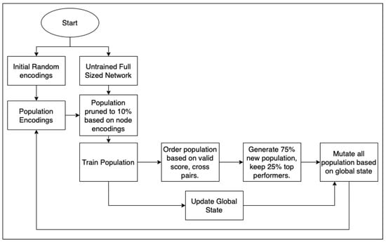 We outline the general structure of the approach in Figure 2. The goal of our approach is to find a pruned network as performant as the original network without having to train the original network. Our previous approach would require the original network trained in order to measure the weights and generate a metric to prune them. With our current approach we do not need to train the original network, although we do in this paper for comparison purposes to validate the approach. This would allow the option to create a large search area for lottery tickets without the consequence of having to train the large network. To avoid training the original network, we pre-prune the network using a genetic algorithm (GA) approach. The genetic algorithm requires a population, and a means to evaluate the population to select and produce the next generation of individuals.