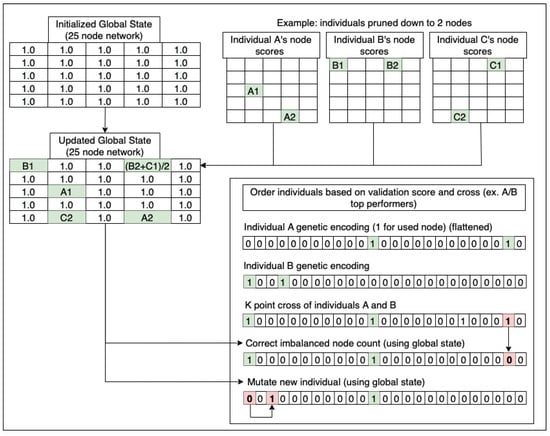 How the global state is updated where each entry is a node quality score updated after each generation. Then the process explains the global state’s involvement in crossing individuals to generate new samples. Node imbalance is maintained to keep a fixed prune rate for new individuals, in this case a fixed prune rate of roughly 90%. Node imbalances and mutations are marked red with bold, green cells (not bold) are tested nodes from subnetworks.