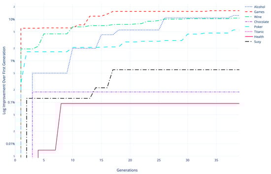 Log chart of the improvement in validation (in percentage compared to the first generation) of each generation. All datasets start at 0% improvement since we compare with the first generation. Note that therefore this means the improvement already obtained from the first generation is not represented in this graph so the validation score plateau does not seem large.