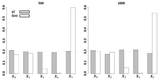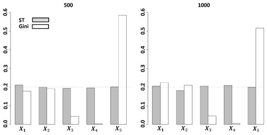 For Model V, it involves an interaction effect between and . According to the literature proposed by Kung et al., when there is an interaction effect between variables, utilizing a strategy of interaction detection such as Algorithm 2 will result in more powerful outcomes. Therefore, we test Algorithm 2 against the Gini method in this study. To keep the effectiveness of Model V, either or should be assigned as a selection variable. Figure 7 shows that the ST method using Algorithm 2 is able to select the correct variables more effectively than the Gini method.