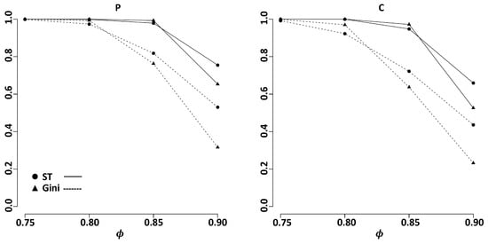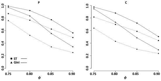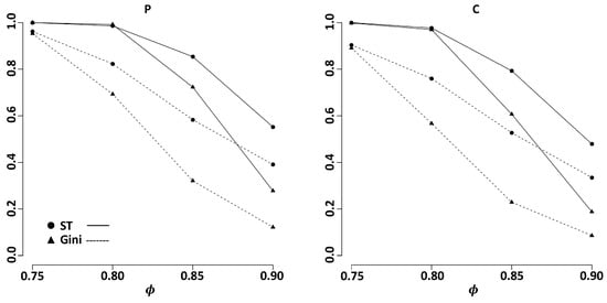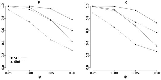 For Model I, a mean shift in changes the response. Therefore, is an important factor in Model I and should be defined as a selection variable. From Figure 3, we observe that the Gini method performs slightly better than the ST method for . This trend continues for when the sample size is 1000. However, for and the sample size is 500 or , the ST method is better.