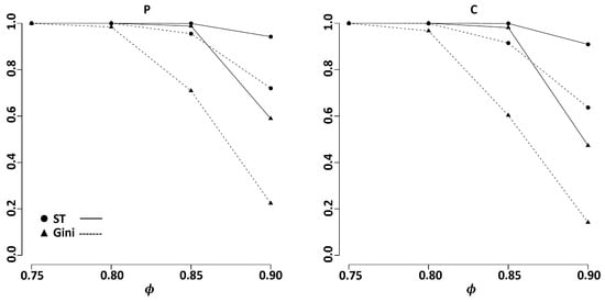 Estimated probability of is selected for the ST and the Gini method under Model I. Data are observed for partial rank (P, top-2) or complete rank (C) and the sample size is 500 or 1000.