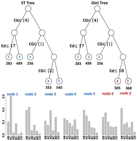 We apply our method to the EVS data and its resulting tree is shown in Figure 8. The bar plots of each terminal shows the proportions of combined partial rank responses in each terminal node. For the convenience of representation, we regard A&B and B&A as the same category. In other words, the label assigns a rank to outcomes regardless of their order, for instance, AB indicates that the ranking is either A&B or B&A. We find that country group and age of education completion are two decisive predictors, which agrees with the finding of Lee and Yu (2010). However, the selection of split variables differs between the fourth and fifth nodes. In the ST method, there is only one cut point selection for the CG variable, whereas in the Gini method, there are more cut point selections for the Ed variable (in fact, 32 cut points). This confirms the discussion of the dependent models in Section 3.2, which shows that the Gini method favors the split variable with more cut points. Therefore, in our analysis of the EVS data, we have more confidence in the ST tree method. Group 4 countries are in node 1 and 2, which are divided by education level. Node 3, 4, and 5 consist of Group 1, 2, and 3 countries, respectively. From the bar plots, we further notice that, regardless of the ordering, the majority of individuals in Group 4 prefer (A) and (C), and individuals with higher education level (Ed > 17) valued (A) and (B) almost as important as (A) and (C). For Group 1 countries, people prefer (A) and (D), while people in Group 3 give priority to (A) and (B). For Group 2 countries, although people prefer (A) and (B), almost equal preference is given to (B) and (D) or (A) and (C).