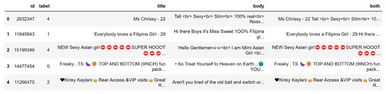 For this study, 12,350 escort ads were obtained from a user agreement with Marinus Analytics. This agreement provided access to the Trafficking-10k dataset [11]. The data included an identification, a classification label (more on this later), a title text, and a body text. The title and body were further concatenated for use. Observations included emojis (images, e.g., 😊) and emoticons (text viewed as images, e.g., :/). Figure 1 shows the first five observations of the original dataset.