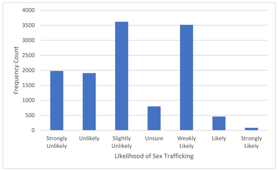 The distribution of online escort ads across the classification label (dependent variable) categories is shown in Figure 5. After recoding, 4054 observations (32.8%) were coded as likely sex trafficking, with the remaining 8296 (67.2%) coded as not likely or unknown.