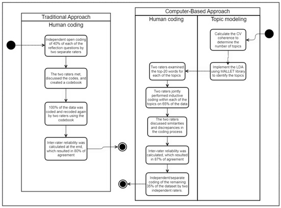 Once the topics were generated automatically for each of the reflection questions, two raters jointly performed inductive coding on 65% of the data and for each of the topics. The raters performed independent coding for Topics 1, 2, 3, and 4 for Reflection Question 1, and Topics 1, 2, 3, 4, and 5 for Reflection Question 2. It is important to note that the raters for this phase of the coding were different individuals and were unaware of the codes generated by the raters, as described in Section 4.3. They met to discuss the similarities and discrepancies. Based on the discussion, the code book was created, and raters re-performed the coding and met again to calculate the interrater reliability. At this point, the two raters performed inter-rater reliability, which was 87%. Later, Topics 5 and 6 were coded independently by Rater 1 for Reflection Question 1, and Topics 6, 7, and 8 were coded independently by Rater 2 for Reflection Question 2.