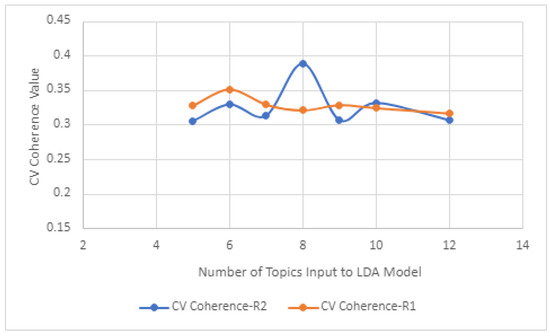 As shown in Figure 3, the peak value of CV coherence for the collection of responses R1 corresponds to the number of topics = 6, and for collection R2, the peak value of CV coherence happens at the number of topics = 8. The number of topics corresponding to the highest CV coherence value is considered to be optimal [27,28]. Therefore, these numbers of topics were used as input for developing the LDA topic models for collections R1 (optimal number of topics = 6) and R2 (optimal number of topics = 8). The topics generated from the LDA topic models were then analyzed qualitatively using the approach mentioned in Section 4.