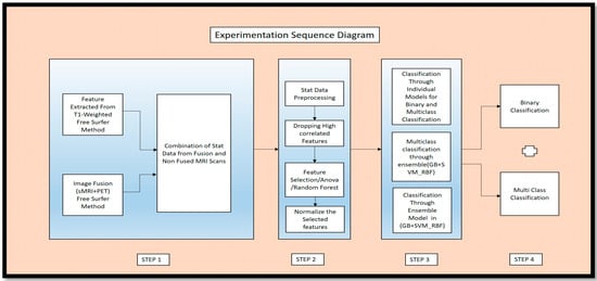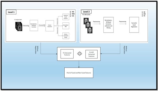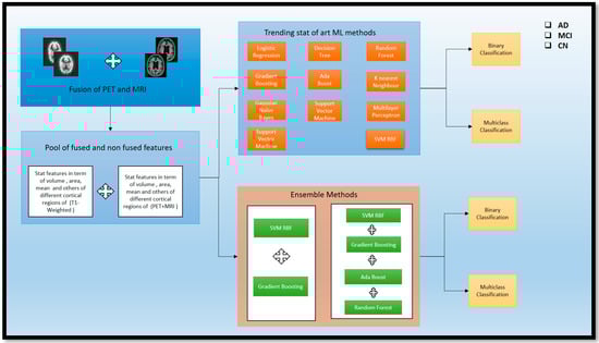 This section discusses the various preprocessing steps required to prepare the data for fusion and the methods to achieve the fusion. In Section 4.1, we detail how we applied the different preprocessing techniques to the T1-weighted images extracted from statistical and volume-generated images. Section 4.2 describes the preprocessing of the PET scans. Section 4.3 describes the fusion of PET and MRI, achieved through the registration technique. Section 4.4 clarifies the fusion of features from the fused and non-fused modalities. Section 4.5 describes the traditional ML methods used, and Section 4.6 describes the ensemble methods used for classifying the different classes: AD, MCI, and CN.