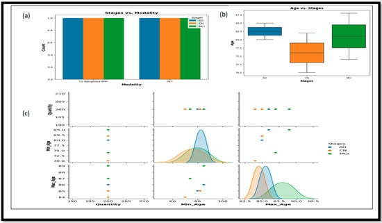 In Figure 2a, the bar plot represents the plot of Stages vs. Modality, which shows the distribution of different stages (AD, CN, and MCI) across the two imaging modalities—T1-weighted MRI and PET. Figure 2b, the box plot of Age vs. Stages, illustrates the age range distribution for each stage, highlighting the differences and similarities in age ranges among AD, CN, and MCI groups. Lastly, the Figure 2c pair plot showcases pairwise relationships between columns in the data set (Min_Age, Max_Age, and Quantity), with different colors representing the various stages.