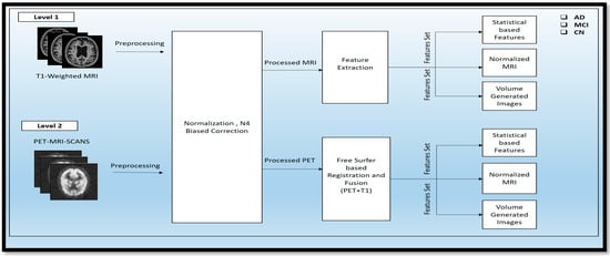 Algorithm 1 that describes transforming the raw T1-weighted data into processed T1wMRIs through the N4 bias correction approach, which removes artifacts and normalizes the images for uniformity. Feature extraction techniques such as Brain Surface Extraction (T1wMRI) and Brain Tissue Segmentation (T1BSE) are applied to compare the different brain regions, followed by Surface Registration (T1BTS) to identify other parts of the T1-weighted image. Cortical Thickness (T1SR) is then calculated, and Sub-Cortical Registration (T1CT) is implemented to produce volumetric shapes, constructed regions, and various cortical and subcortical brain regions in stat files. After completing level 1 experiments, similar preprocessing steps are taken to prepare the PET modality for the fusion process.