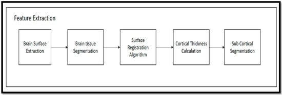 Following the preprocessing stage, the T1-weighted modalities undergo feature extraction methods. The Free Surfer methods are used for feature extraction, which consist of various fundamental algorithms that help to identify additional features in the brain region. This method uses the Brain Surface Extraction technique, which combines surface modeling and deformable models to identify the brain regions from MRI scans. The technique works on the principle of identifying curves that represent the different boundary regions of the brain. These boundaries are refined using other deformable methods available in the automatic pipeline method. Then, the Brain Tissue Segmentation technique uses a deformable model and MNI-template-based atlas to segment the different parts of the brain and identify areas with white matter (WM), grey matter (GM), and cerebrospinal fluid (CSF). The Surface Registration approach is employed to register the MRI images of the subject’s brain to a standard brain template and one another, to examine the regional brain volume and cortical thickness. This involves normalizing the intensities of the subject’s MRI scans using the standard template. The cortical thickness estimation is performed through surface modeling and the linear registration of the tissue segmentation results. To segment the brain into different subcortical structures such as the amygdala and Hp, atlas-based segmentation and intensity normalization are used. The entire process follows a professional and technical approach.