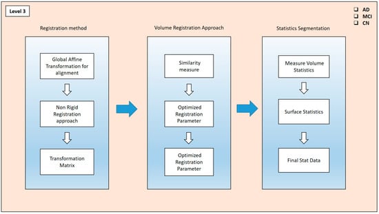 Algorithm 3 that is fusion of the T1 scans and PET modality. Here, in this table, we first applied the bb-registration methods for performing the registration, including global affine transformation and non-rigid transformation, and then we returned the registered modality. Then, these fused modalities went to volume-to-volume mapping, where they were altered in the similarity measurement and correlation matrix, and we returned the matrix. From the correlations matrix, the stat features were extracted, including the volume statistics and surface statistics for the variation in the classification of AD, MCI and CN classes.