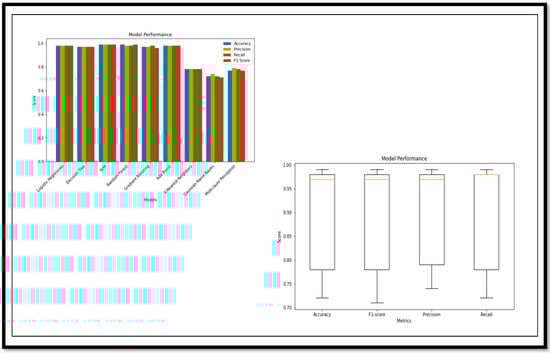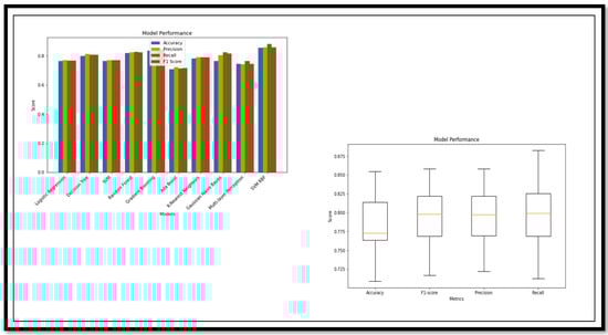 Based on the results, the ensemble model has lots of potential for the m=Multi Class classification of AD and its subtypes. There was a sustainable (Acc) achieved in the Multi Class through the ensemble model as compared to standalone learning methods. The ensemble model (GB_SVM_RBF) has the highest (Acc), with 96.36% (Acc) and an (F1sco) of 96.36%. In contrast, the Logistic Regression model has the second-lowest performance in both (Acc) (58.18%) and (F1sco) (57.27%). Other models, such as (RF), (GB), and (SVM_RBF) also demonstrate strong performance, while models such as (GNB) and (MLP) are less accurate and have lower (F1sco) levels. The performance analysis, using a graph and a box plot, of all the models for these classifications is described in Figure 15.