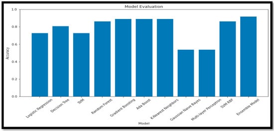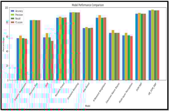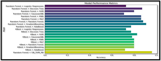 Table 6 presents the accuracy (Acc) of various combinations of feature selection methods and classification models. The ensemble model ‘RF + GB’ achieves the highest accuracy (90.91%) among the non-ensemble models. The original ensemble model, ‘GB_SVM_RBF’, outperforms all the other models, with an accuracy of 96%. Comparing the feature selection methods, models using ‘RF’ generally achieve higher accuracy than those using ‘KBest‘. Among the classifiers, ‘DT’, ‘KNN’, and ‘MLP’ consistently yield relatively high accuracy scores when combined with different feature selection methods. The ‘GNB’ and ‘AB’ classifiers result in lower accuracy scores in most cases, indicating they may not be the most suitable classifiers for this data set. The ensemble model ‘GB_SVM_RBF’ demonstrates the best performance, and utilizing the ‘RF’ feature selection method yields superior results to the ‘KBest’ method. The plot for this study is represented in Figure 17.