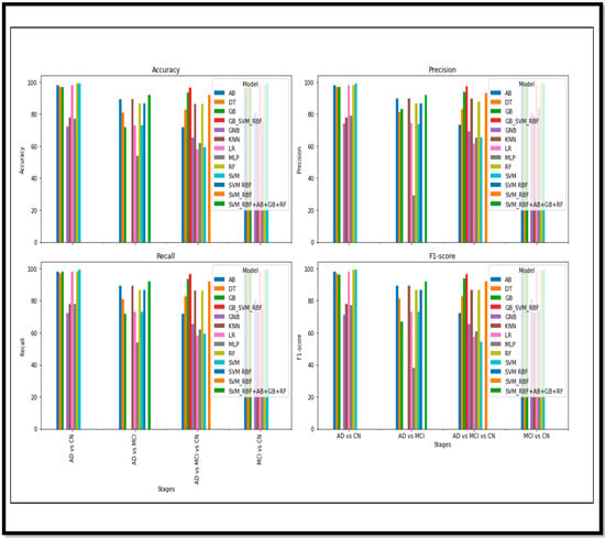 Regarding the fusion of the features and images, the results have effectively shown progress in detecting AD and its stages. The fusion approach has significantly outperformed other non-fusion methods. Figure 15 demonstrates the different performance metrics of the various models for the Binary and the Multi Class classification of AD. An acceptable (Acc) is achieved in the Binary Class classification. Many ML and ensemble models have outperformed and shown sustainable (Acc). However, for Multi Class, the (Acc) is also acceptable, but when comparing with the Binary results, there is still room for improvement. The results achieved in this article are compared and validated with the recent research conducted in AD detection in Table 7.