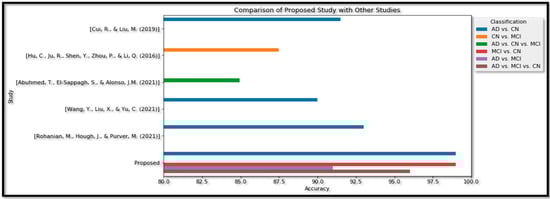 The proposed study, as shown in the table, utilized a combination of image fusion, feature-level fusion, and ensemble methods for classification. For the Binary classification of AD vs. CN, an accuracy of 99% was achieved, which is higher than the accuracies obtained in other studies. In the Binary type of MCI vs. CN, an accuracy of 99% was obtained. For the Binary classification of AD vs. MCI, an accuracy of 91% was achieved.