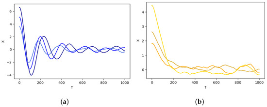 Example of classification of vibration systems where shapelets (oscillation patterns) are proxies for latent parameters (damping ratio). Each plot contains the responses from three example systems of the same system type (illustrated with different shades of the same color). For these systems, a label, correlated with the damping ratio , can be potentially predicted by shapelet-based classifiers; however, a conventional saliency method applied to this problem will only highlight a proxy of the informative latent feature, namely, the existing fluctuations and oscillations of the time series. (a) Underdamped systems: ; (b) overdamped systems: .