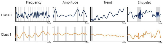 Explainability toy examples of multiple label-making scenarios in the time series domain. Per each column, example time series are colored blue for class 0, and gold for class 1. Influential time steps (regions with high saliency scores) are shaded in gray for frequency (the peaks), amplitude (highest peaks), trend (a window enough for inferring about the trend), and shapelet (presence of the informative pattern) [5].