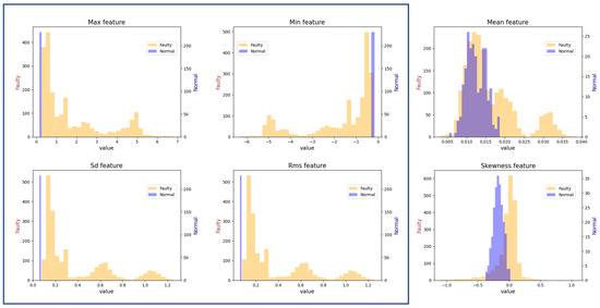 To supplement the simulation studies, we tested the saliency methods on a real-world dataset in which the label depends on the parameters of a latent model (known by prior knowledge). The CWRU Bearing Dataset [37] is a predictive maintenance dataset containing vibration data from 2300 bearings for bearing failure prediction. Defects of different sizes and locations were exerted on a group of bearings, resulting in highly diverse vibration signals at operation. The dataset is unbalanced, with a 90% failure percentage. In addition to the raw time series data, the dataset provides nine handcrafted features. Figure 3 illustrates the histogram of six of the nine features per class. As depicted, the maximum, minimum, standard deviation, and root mean square features significantly distinguish between the two classes. These features are highly associated with the amplitude and frequency of a signal, implying that assuming an association between latent parameters and the label is a valid assumption for vibration signals. Other noninformative features not depicted are kurtosis, crest, and form. Analysis of the feature-based classification revealed the “maximum” feature as the most important among the provided features, signifying the label–Fourier series amplitude association.