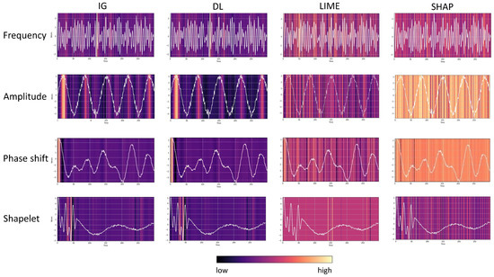 Comparison of importance heat maps from feature attribution methods IG, Deep-Lift, Lime, and SHAP for the CNN + SGT on a frequency, amplitude, phase shift, and shapelet experiment, respectively. Explanations provided by IG and Deep-Lift clearly focus on aspects related to the latent feature (peaks and valleys for amplitude and frequency, beginning of time sequence for phase shift) and the shapelet, respectively. Maps of Lime and SHAP are visually uninterpretable [5].