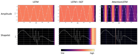 Figure 5 depicts examples of the saliency map given by the method IG for the standard LSTM, the LSTM + SGT, and the ante hoc AttentionLSTM (left to right). The LSTM appears to suffer significantly from the vanishing saliency problem since the scores are uniform across the entire time series except for the last time points. Contrary to the observations by Ismail et al. [35], the saliency-guided training procedure did not help to diminish this problem. On the other hand, the input-cell attention mechanism strongly improved the performance of the employed gradient-based saliency method. If the label is based on amplitude, only on the input-cell attention LSTM can the method IG correctly highlight amplitude-related patterns. The saliency method IG could not highlight the shapelet in the middle of the time series on the LSTM and LSTM trained via saliency-guided training. On the input-cell attention LSTM, the method correctly identified the start of the shapelet as important.