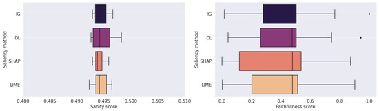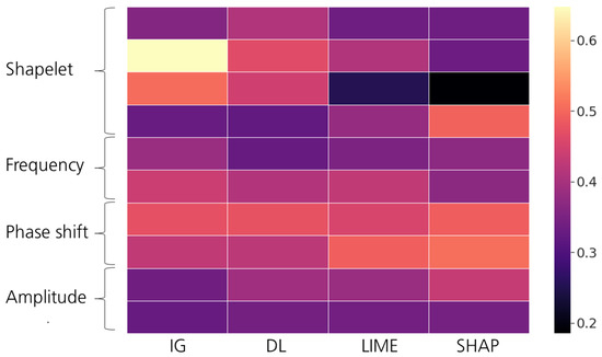 Figure 7 presents the average sanity and faithfulness scores for post hoc methods across the three well-performing classifiers (AttentionLSTM, TCN, and CNN + SGT) and the synthetic datasets. As depicted, no method significantly outperforms other counterparts in both scores. In a closer examination, Figure 8 presents faithfulness scores per experiment averaged across all classifiers. IG and DL scored slightly higher in the shapelet experiments, especially when a shapelet was introduced at a fixed position (experiments 2–4). The SHAP and LIME methods, whose maps were visually uninterpretable in previous steps, obtained a heightened score on the phase shift experiments (7 and 8). Although these results roughly align with our original hypothesis and the visual evaluation, small differences among the experiments must be pointed out.