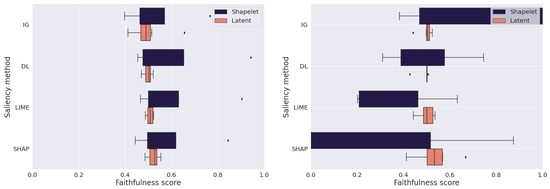 With a focus on more successful classifiers based on Table 3, we measure faithfulness scores for CNN+SGT and TCN individually. As presented in Figure 9, scores are relatively similar for CNN+SGT across different experiments and saliency methods. On the other hand, for the TCN classifier, the effective IG method achieved significantly higher scores in the shapelet experiments than in the latent experiments. Significant differences are also visible in the case of other saliency methods, however not in favor of the shapelet experiments. As an extreme case, SHAP achieves lower scores in the shapelet experiments. In general, the faithfulness score in the latent experiments is close to the average (Figure 7).