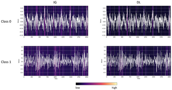 Figure 11 presents saliency maps produced by IG and DL for positive and negative samples in the CWRU dataset (a reproducibility comment: by rerunning the provided code, the user will obtain inverted heat maps, i.e., dark color on peaks and light color elsewhere). Both saliency methods consistently highlight the time series’ peaks, i.e., the maximal values. This result aligns with the importance analysis of the nine extracted features reported in Section 3. Further examination reveals a vast difference in the overall amplitude of the signal between the two classes. The maximum value thus effectively works as a proxy for the class-distinctive feature amplitude. From an explainability perspective, however, the resulting scores do not immediately offer any implication about the assumed latent features. This challenge will be more aggravated in real-world datasets with more complex latent models.