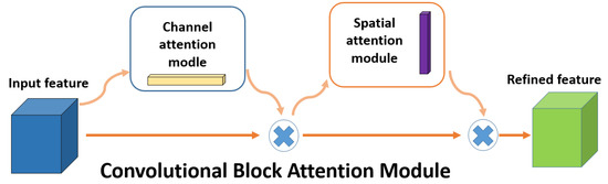 Attentional mechanisms focus on obtaining local information, which works by imitating the way humans pay attention. It devotes more attentional resources to the target region to obtain more target information and suppresses background information. The main ones are squeeze-and-excitation networks (SE), proposed by Hu et al. [28], and the convolutional block attention module (CBAM) [29], which was advanced by Woo et al. The mechanism used in this paper is CBAM, which is a combination of channel and spatial attention mechanisms. It obtains more information about the channel where the target is located by performing an attention operation on the channel; it performs an attention operation on the space to ensure that the target location information is better obtained and improves the accuracy of target detection. The CBAM attention mechanism is shown in Figure 2.