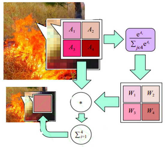 Spatial pyramid pooling is a multi-scale feature fusion pooling method that can preserve object features well [30,31], maintain feature map shape, and output fixed-size features with any feature image size as input. The pooling operation, as one of the most basic algorithms for image processing in the field of deep learning, can reduce the size of the feature map of the model by retaining some features while reducing the computational cost, preventing overfitting, and improving the model’s generalization ability. In CNN, the common pooling methods are average pooling and maximum pooling. Average pooling is an averaging operation on the neighborhood feature points, which can preserve the background information well and make the image smoother. However, it will cause feature information loss. Maximum pooling obtains the maximum value of neighboring feature points, which can extract obvious texture feature information well. Thus, it is more suitable for a convolutional neural network to retain prominent features and speed up the model response. It is also easy to ignore some detailed feature information. SoftPool is a variant of a pooling structure with the original pooling layer function while retaining more feature information. The SoftPool method can reduce the risk of losing detailed features during pooling and has good feature retention for small targets. Thus, we propose using SoftPool instead of MaxPool in spatial pyramid pooling to better preserve the detailed features of the fire and enhance its detection [32,33,34]. The calculation process of SoftPool is shown in Figure 3.