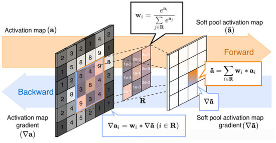 where denotes the output value of feature points after SoftPool, obtained by the standard summation of all weighted activations in the kernel neighborhood R, as shown in Figure 4.