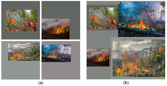 Since the acquired image scenes are limited, to enrich the scenes, the images are augmented by the method of blending backgrounds. Firstly, a forest image is randomly selected as the background. Secondly, a fire image is obtained by keying out the flames on the image and then fusing the flames with the background image using an image fusion technique [41].