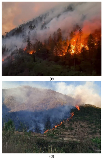 Partial images of the dataset. (a,b) Typical forest fire and (c,d) forest fire from the UAV view. (a) Typical canopy forest fire; (b) Typical surface forest fire; (c) Canopy Forest fire from UAV view; (d) Surface forest fire from the UAV view.
