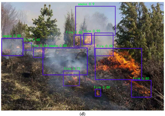 The detection results of the YOLOv5 and YOLOv5-IFFDM models for forest fire and smoke from the UAV camera view. (a) Fire and smoke detection using YOLOv5; (b) Fire and smoke detection using YOLOv5-IFFDM; (c) Fire and smoke detection using YOLOv5; (d) Fire and smoke detection using YOLOv5-IFFDM.