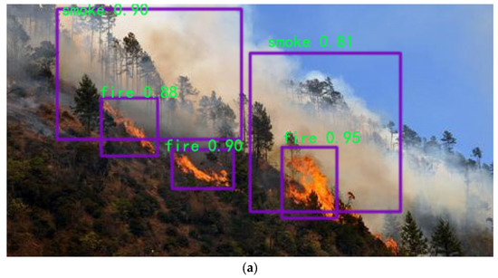 Experiment III further improves detection accuracy by replacing the spatial pyramidal MaxPool pooling structure with SoftPool. In experiment IV, the loss function in YOLOv5 is changed to α-IoU, the forest fire accuracy is improved, and the forest smoke detection accuracy is basically unchanged. The detection accuracy of forest fires and forest smoke was improved after adding dataset mosaic preprocessing and re-clustering anchors to experiments V and VI. The merging of the convolution and BN layers was performed in experiment VII, and the detection accuracy did not improve, but the detection speed increased substantially, indicating that the prediction speed is indeed affected when the convolution and BN layers are separated, as expected. The model’s accuracy in this paper is 90.5% and 84.3% for forest fire and forest smoke, respectively. Compared with the YOLOv5 model, the mAP of this model is improved by 8.5% and 5.3%, respectively, suggesting that the model has better results in forest fire classification detection.