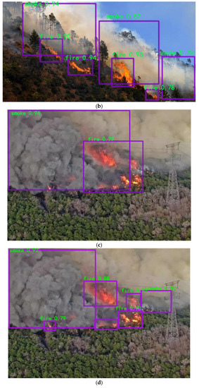 The results of the YOLOv5 model and the YOLOv5-IFFDM forest fire classification and detection model are shown in Figure 8 and Figure 9. Figure 8 shows the detection of a sample of forest fire training images with typicality, and Figure 9 shows the detection of forest fire image samples from the UAV camera view. From the detection result, the YOLOv5 model detects that the rectangular box of the forest fire is not located in the same place as the real box. As a result, the missing detection problem will occur, and the detection performance will be poor. YOLOv5-IFFDM model detection aligns more with the real forest fire target frame. The model has better detection of forest fire types and fewer false detections of leakage. Experiments show that the model YOLOv5-IFFDM proposed in this paper is more suitable for forest fire classification detection.