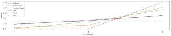 The weights obtained from different weighting schemes for three nearest neighbors with distances .