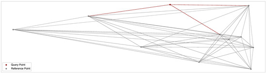 Visualization of the reference points as a normalization set, where the dotted red lines indicate the connection of the query point to its nearest neighbors in the reference set, and the gray lines indicate the distance relationships between the reference points.