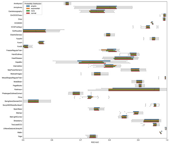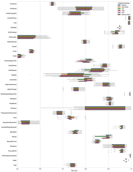 To evaluate the probabilistic transformation on tabular data, we used the proposed weighted k-nearest neighbor approach (). The datasets used stem from the DAMI [82] library and the UTSD single-concept benchmark [83]. For both dataset collections, we only used the datasets with five percent of outliers, each consisting of ten randomly sampled variants, resulting in the dataset list shown in Table 1. For DAMI, we used the normalized and deduplicated variants, and for UTSD, we pre-processed the data points with min–max scaling. We used two-fold, stratified cross-validation to determine an ROC AUC and AP estimate of the resulting distance-based and probabilistic estimates. We used Euclidean distance for all evaluations and fixed the hyperparameters for the weighting schemes as , as shown in Figure 1. For the number of neighbors k of our tested method, we picked the best parameter from all possible values of . In our first analysis, we investigate the impact of score normalization using different probability distributions. We examine a normal, exponential, and empirical distribution and compare it to the base case where no distribution is used for normalization. To visualize the results of our tabular ranking evaluation, we use box and whisker plots that show the interquartile range (IQR) in a colored area with corresponding whiskers depicting 1.5 IQR and points outside the whiskers drawn individually. In Figure 3, we show that the ROC AUC result after the transformation matches the original result and the transformation is indeed ranking-stable. To analyze the impact on detection performance, we evaluate the mean average precision over all datasets as shown in Table 2. There are no significant differences between distance and probabilistic scores regarding detection performance for the tested weighting schemes. In our second analysis, we compare the performance of different weighting schemes over all described datasets. We find that, over all datasets, there is no significant difference in outlier ranking or predictive performance between the different weighting schemes. There can be more considerable weighting scheme differences for individual datasets; however, those are dataset-specific and must be investigated case by case, as shown in Figure 4. We also note that weighting scheme hyperparameter optimization might yield additional improvements, which we did not address in our analysis.
